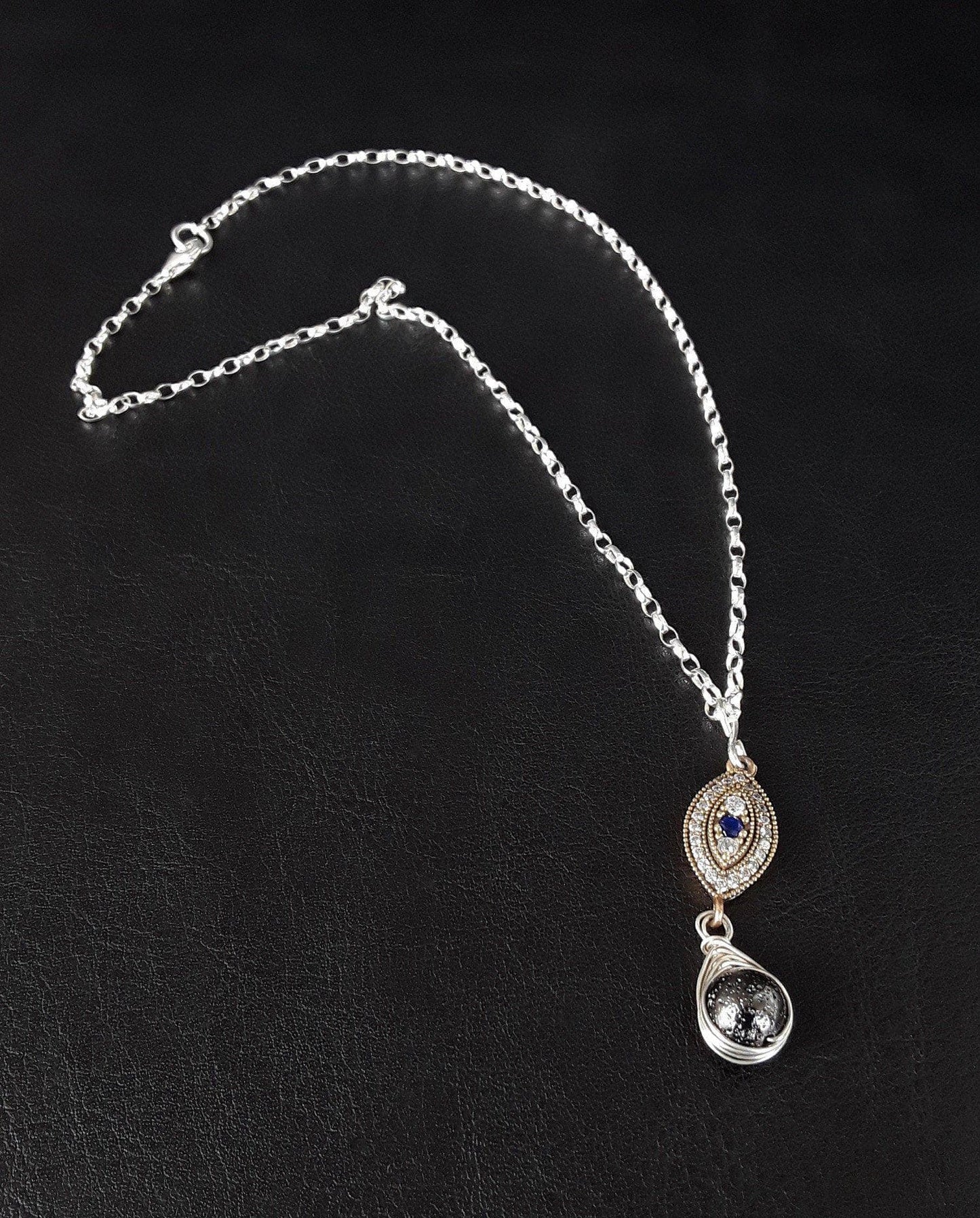 For these purposes the Necklace has been created based on AAA+ galvanized Lava Stone, combined with a Silver Brass Devil's Eye bead and the finishing touches of 925 pure Silver.