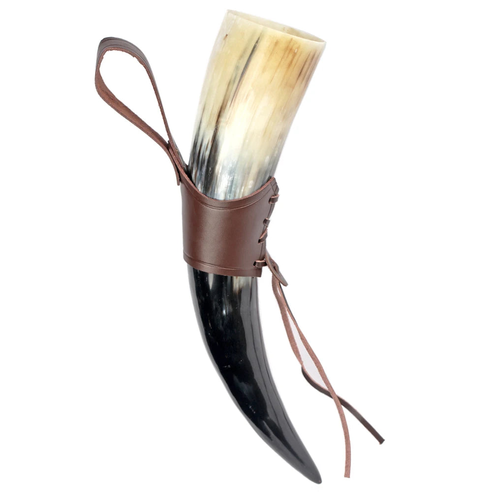 Crafted from genuine ox horn, this Viking-inspired drinking mug brings raw character and tradition to every pour. Each horn features natural color variations and unique markings, making every piece one of a kind. Polished smooth on the inside and finished with a leather strap for easy carrying, it’s designed for both function and display.