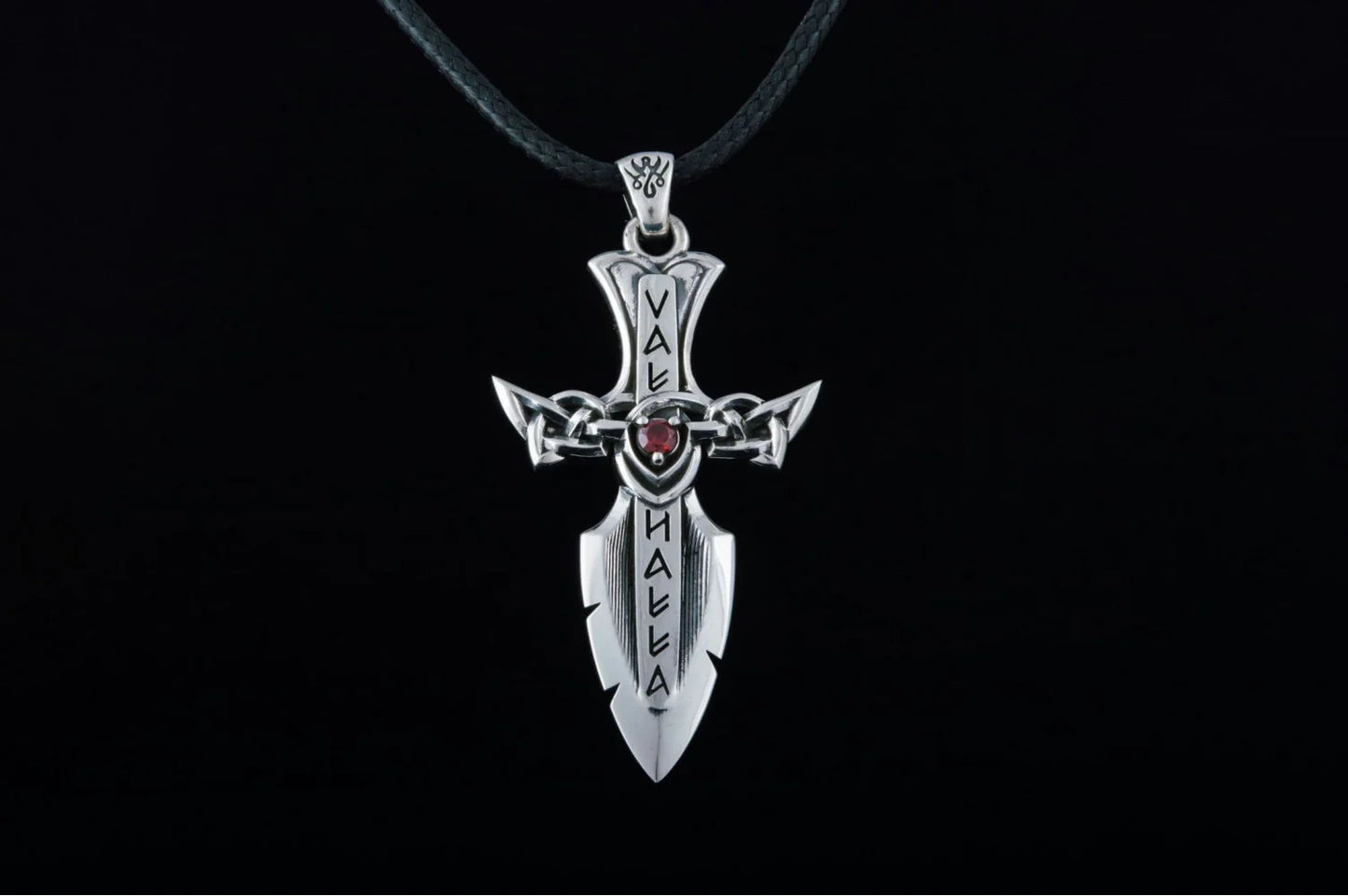 Introducing the Norse Sword with Runes and Cubic Zirconia Pendant, a striking piece of Viking jewelry crafted from sterling silver. This pendant takes the form of a sleek, detailed sword, symbolizing strength and protection in Norse mythology.