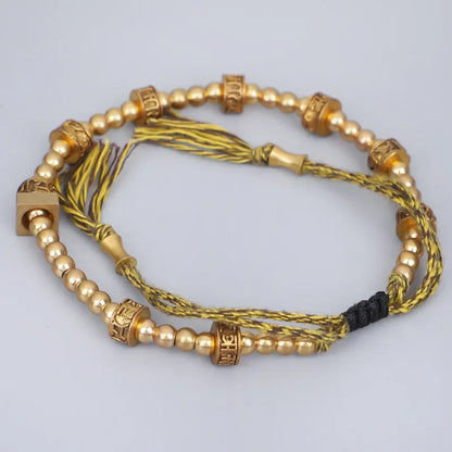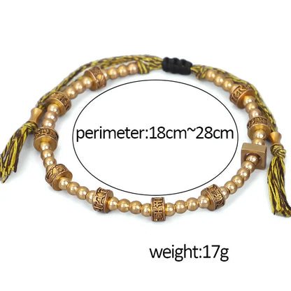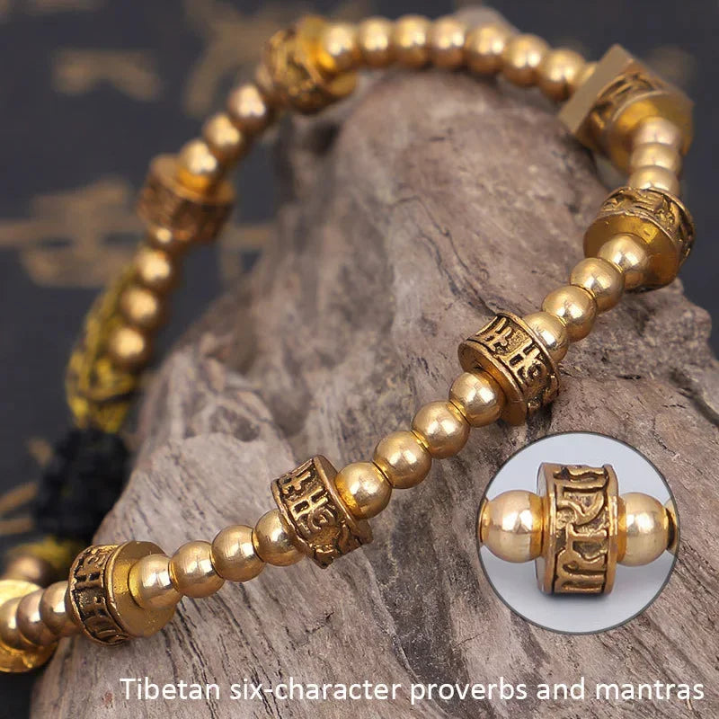This handcrafted Tibetan Mantra Bead Bracelet features engraved brass beads, each inscribed with ancient mantras traditionally used for protection, peace, and spiritual awakening. Inspired by the turning of prayer wheels in Tibetan Buddhism, the beads are designed to channel positive energy with every movement.