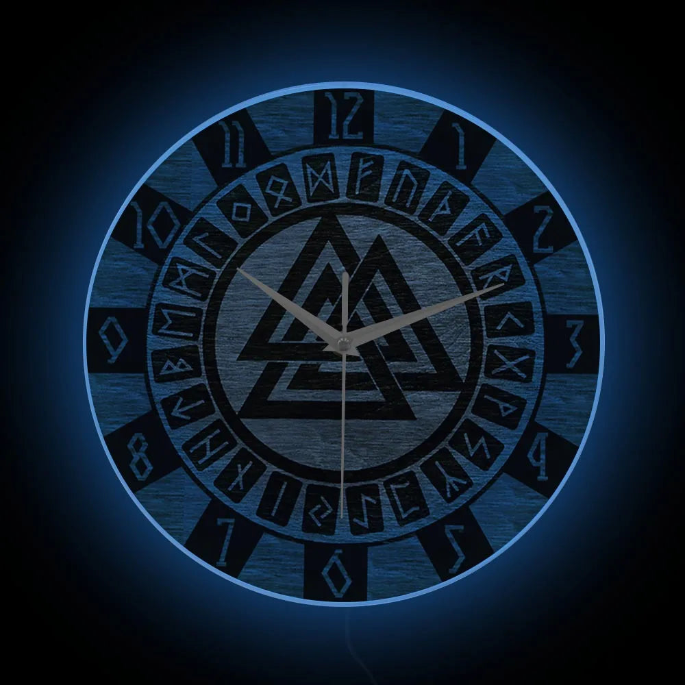 At the center lies the Valknut — a powerful symbol associated with Odin, fate, and the passage between worlds — surrounded by runes and Celtic-inspired patterns. Combined with a modern clock design and subtle LED backlighting, this piece bridges ancient myth and contemporary décor.