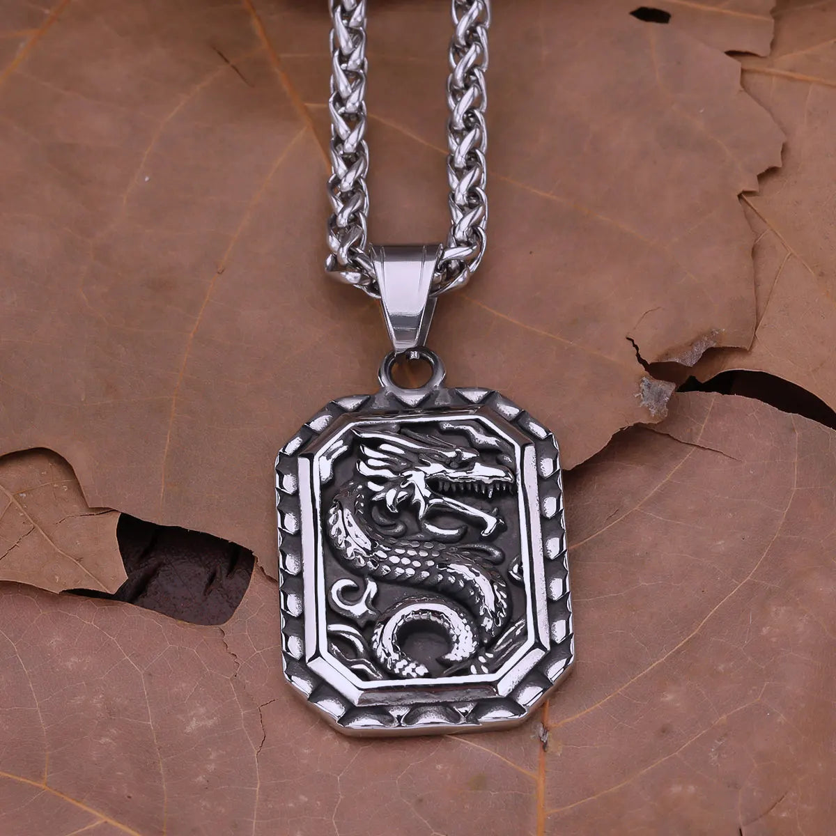 Unleash your inner warrior with this bold Viking Dragon Amulet Necklace. Crafted from durable stainless steel, this piece showcases a fierce coiled dragon surrounded by a Celtic-inspired border, symbolizing strength, protection, and untamed spirit. With a sturdy 60cm chain, it’s a perfect statement piece for those who walk the path of legends.